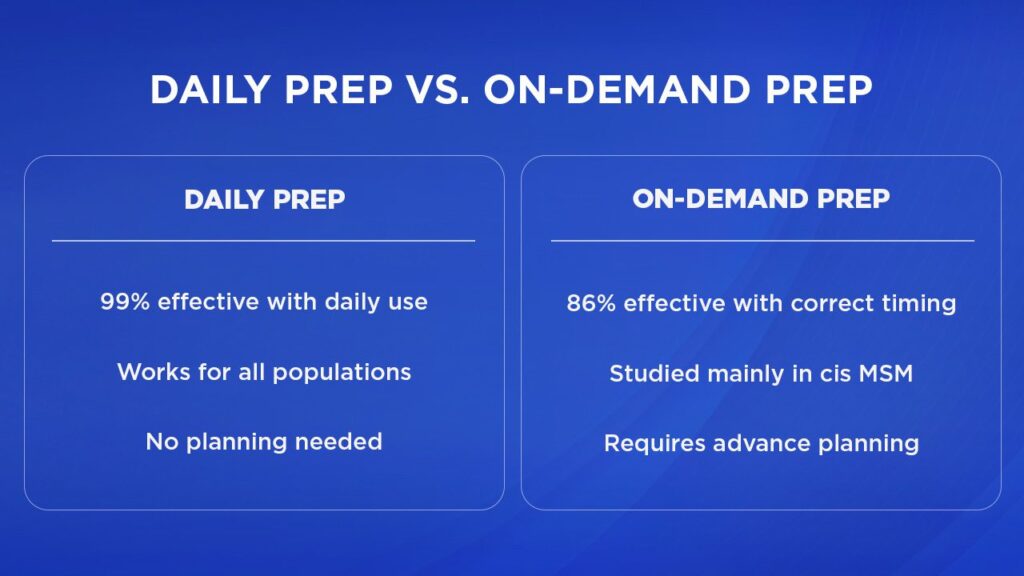 Timing matters a lot. You need to plan ahead and take those first two pills at least 2 hours before sex (though 24 hours is even better). If sex happens spontaneously or you forget to plan ahead, you’re not protected. With daily PrEP, as long as you’re taking it consistently, you’re covered whenever sex happens.